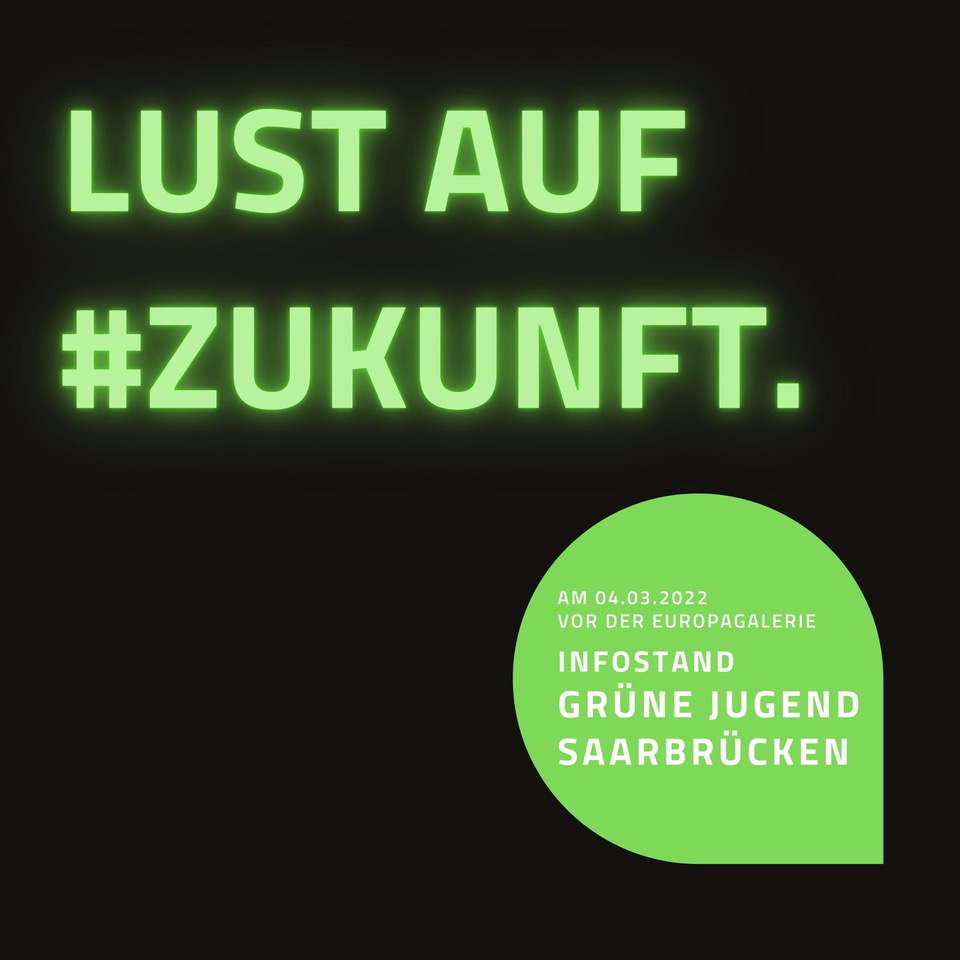 Am 04.03. machen wir in Saarbrücken Lust auf #Zukunft! Anlässlich der Landtagswahl wollen wir unsere Kandidat*innen unterstützen und die Wähler*innen in Saarbrücken im Alltag abholen um auf unsere Partei aufmerksam zu machen. Seid dabei und kommt zwischen 15 und 18 Uhr zu unserem Infostand vor der Europagalerie! Wir freuen uns auf euch!