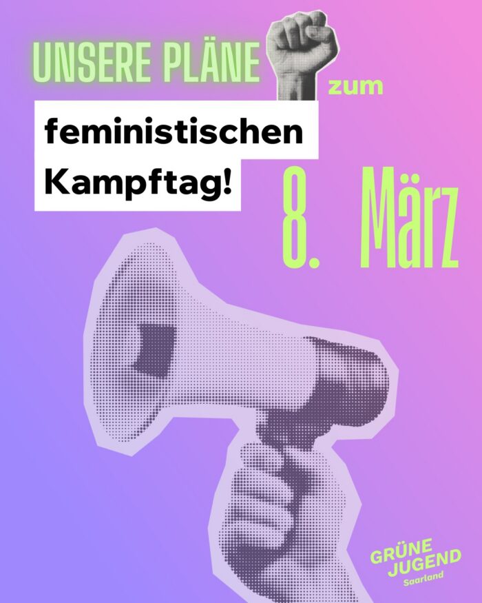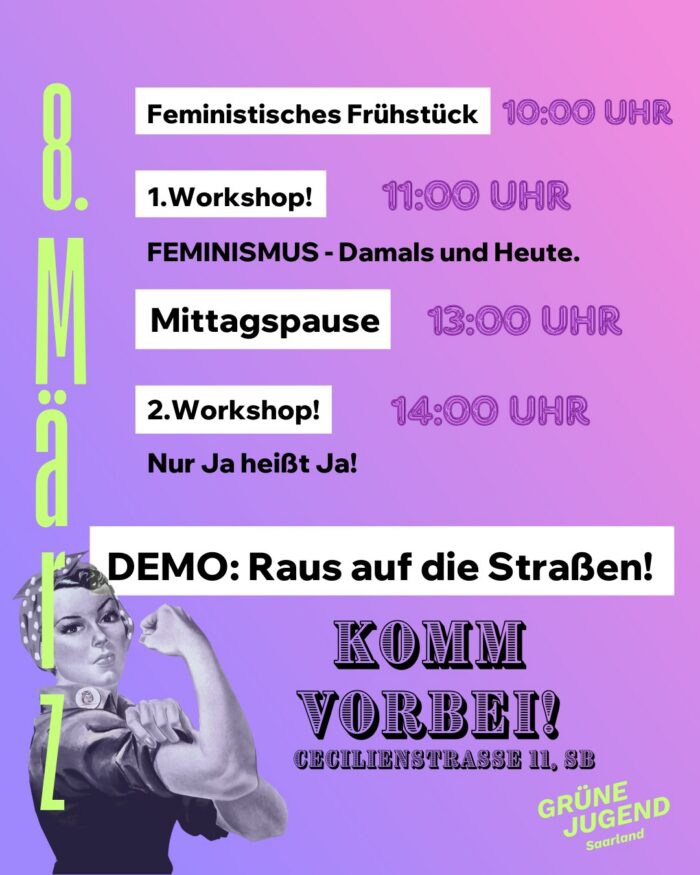 Die Grüne Jugend Saar lädt ein zu einem tagesfüllenden Programm zum Feministischen Kampftag am 8. März 2026!